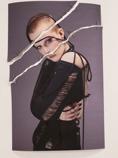 “The Upside Down:" mixed media, 90 x 58 x 67 inches. I wanted to focus on mental health and the imperfections we have as humans. Society's expectations cause unnecessary self-criticism that leads people to dissect themselves in unnatural ways. Every human is beautiful just the way they are and when we deconstruct and overanalyze ourselves the stigmas placed on us by others cause us to view ourselves in negative ways. If you are only looking at a person from the outside, you are not really seeing them at all.For this image I rotated the image upside down to make it more compelling. I chose the yarn because it added a layer of mass to the photograph and symbolizes the extra weight we carry as human beings sometimes physically, sometimes mentally and often both. I used three different materials and ripped them into three different pieces and layered them on top of one another to create some dimension.