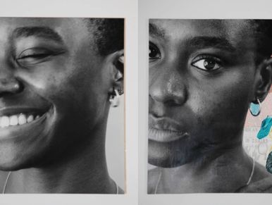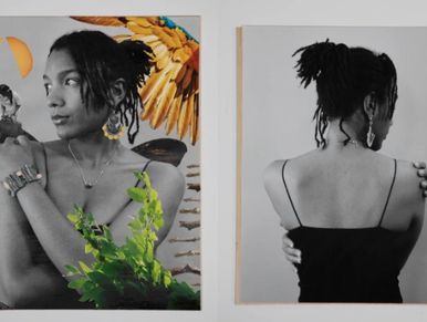 Mixed media photo collage, 16 x 20 inches each. Taking 'Fringe' to mean the margins of a partiulcar group, and the group to be society, I set out to make portraits of Black women. Each participant has two portraits, both photographed in black and white, one featuring a collage that is representative of the participant's world; their perspective. Prior to each shoot, I had a conversation with the participant to serve as a guide for later creating the collage. I asked the question: "What do you think has shaped the way you move through the world the most?" in an attempt to discover the true essence of their identity. With Portraits I, the conversation revolved around a love for nature, the colours yellow and green, and a deep curiosity since childhood. With Portraits II, cultural roots, learning, achievement, and escaping reality through media.