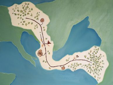 Oil and thread on canvas, 24 x 30 inches (double sided) Trinh and Nancy aim to convey their personal interpretation of the Syrian refugee crisis through their artwork, which is inspired by the documentary "Human Flow" by Ai Wei Wei. The work reflects the path of Syrian refugees through seven countries by land and sea until they reach Germany. The artwork incorporates a double-sided composition, with the front side portraying Syrian traditional patterns amid support from friendly nations. On the other hand, the reverse side uses intertwined threads to represent the harsh realities and challenges of the situation.